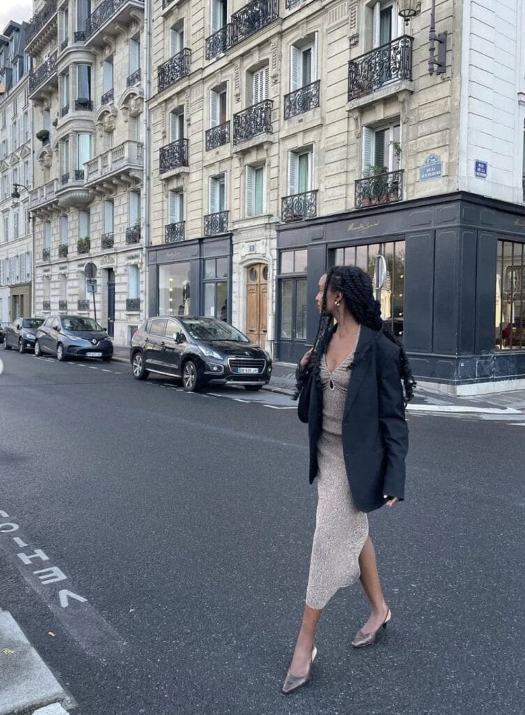 This effortlessly put-together vibe features a champagne rib-knit midi dress paired with an oversized black blazer. Statement heels and a minimal necklace add just the right amount of polish for a stroll through those iconic Parisian streets.