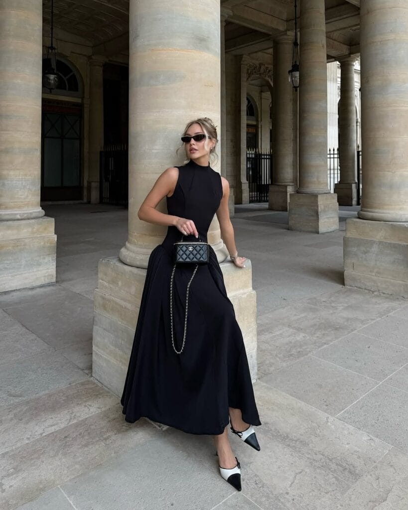 @ fleurraffanServing timeless glam, this look features a sleeveless black maxi dress with a chic halter neckline and flowy silhouette. Paired with pointed black-and-white heels, it’s the ultimate Parisian evening outfit.