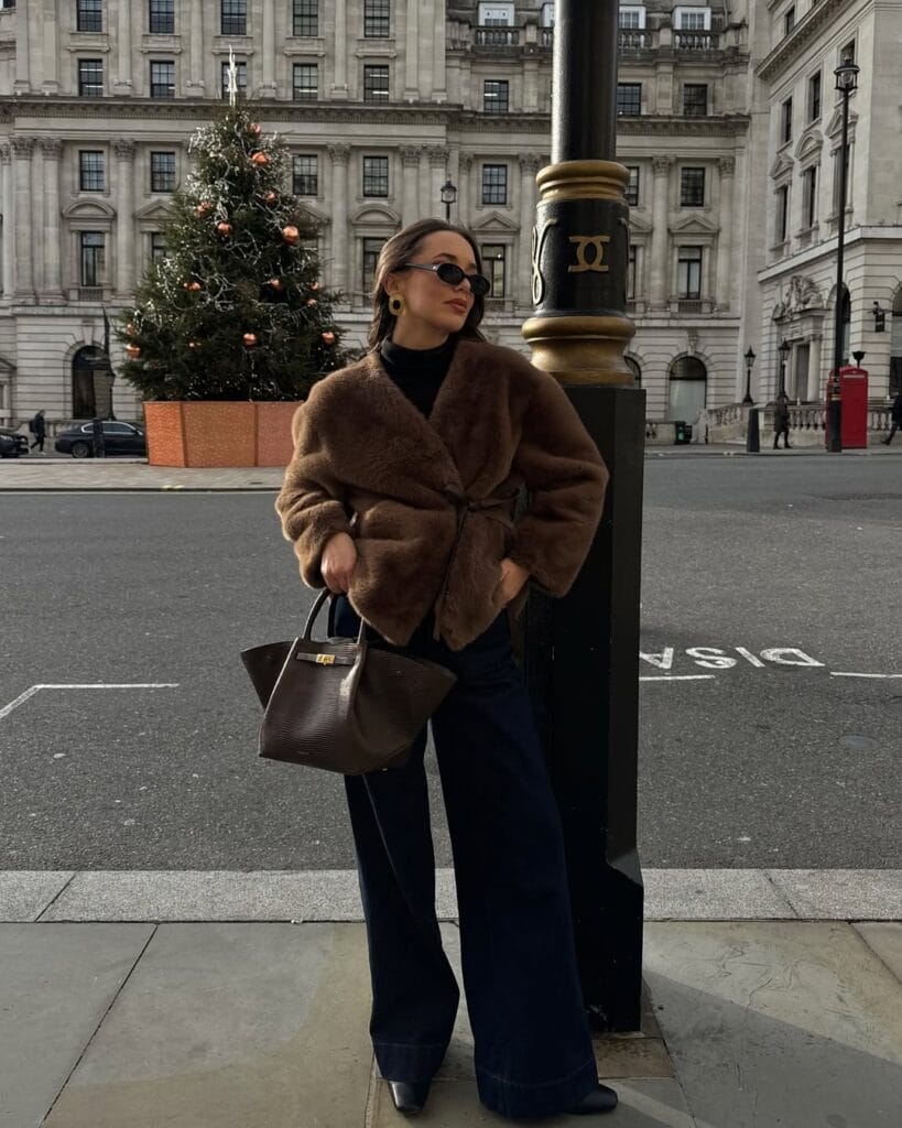 22. Luxe Brown Faux Fur Jacket & Dark Flared Jeans