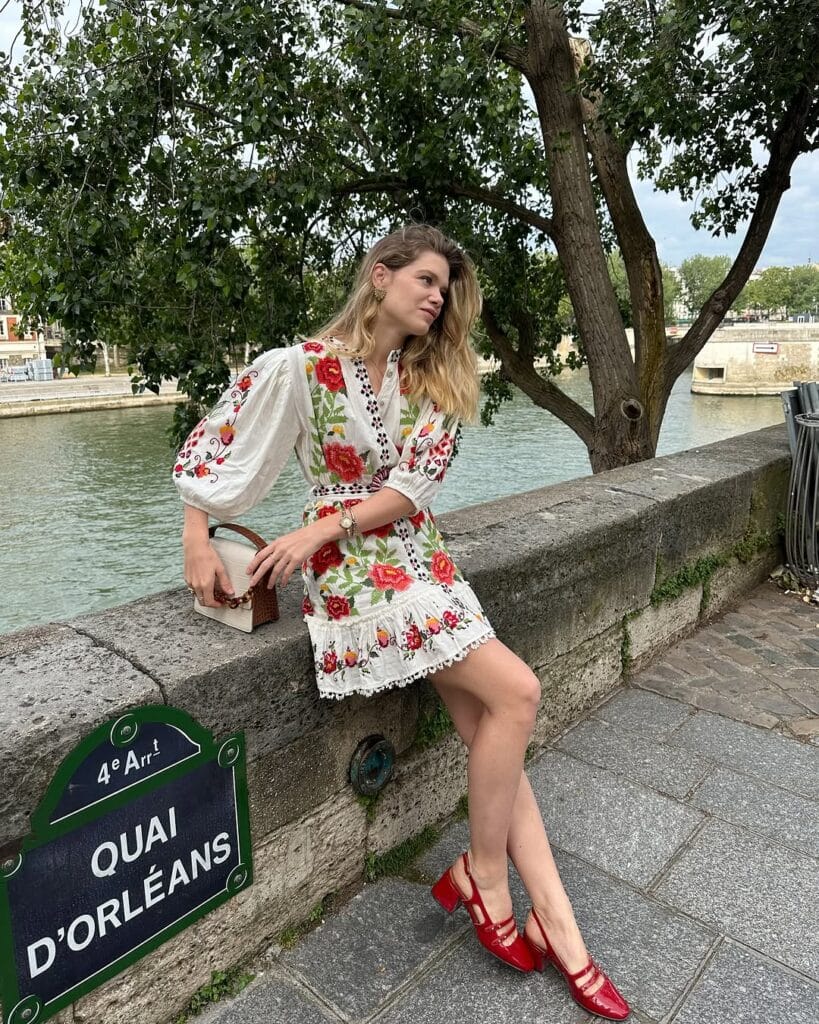 This fit is straight out of a Parisian daydream—a white mini dress covered in bright red floral embroidery and lace trim. The look pops with puffed sleeves and vibrant red Mary Jane heels, making it so sweet and fun for a stroll by the Seine.