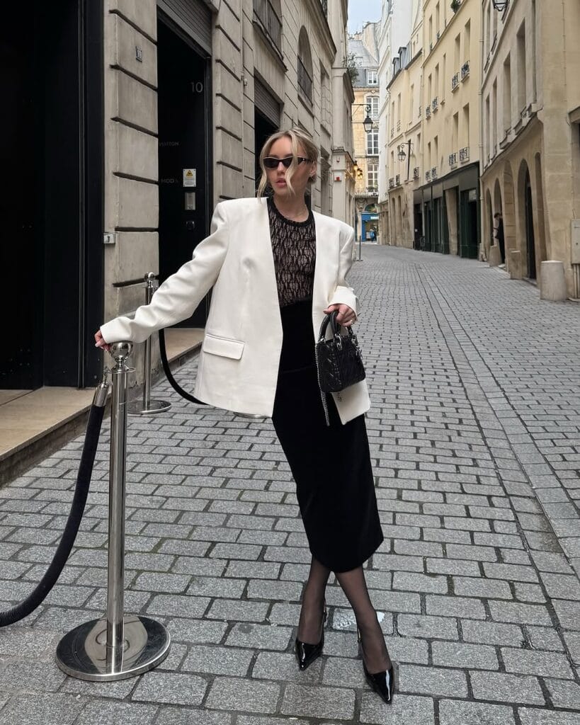 @ fleurraffanEffortless and striking, she pairs a crisp oversized white blazer with a black lace top and a fitted black midi skirt. Patent black heels and a quilted mini bag bring Parisian edge to this neutral palette.