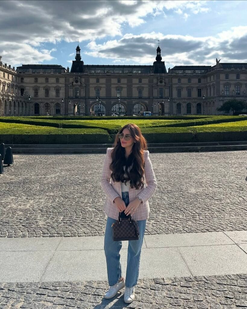 @ thisis_rashaLoving this classic Parisian combo: a soft pink tweed blazer layered over a white blouse, styled with relaxed blue jeans. She keeps things casual yet polished with white sneakers and a chic top-handle bag.