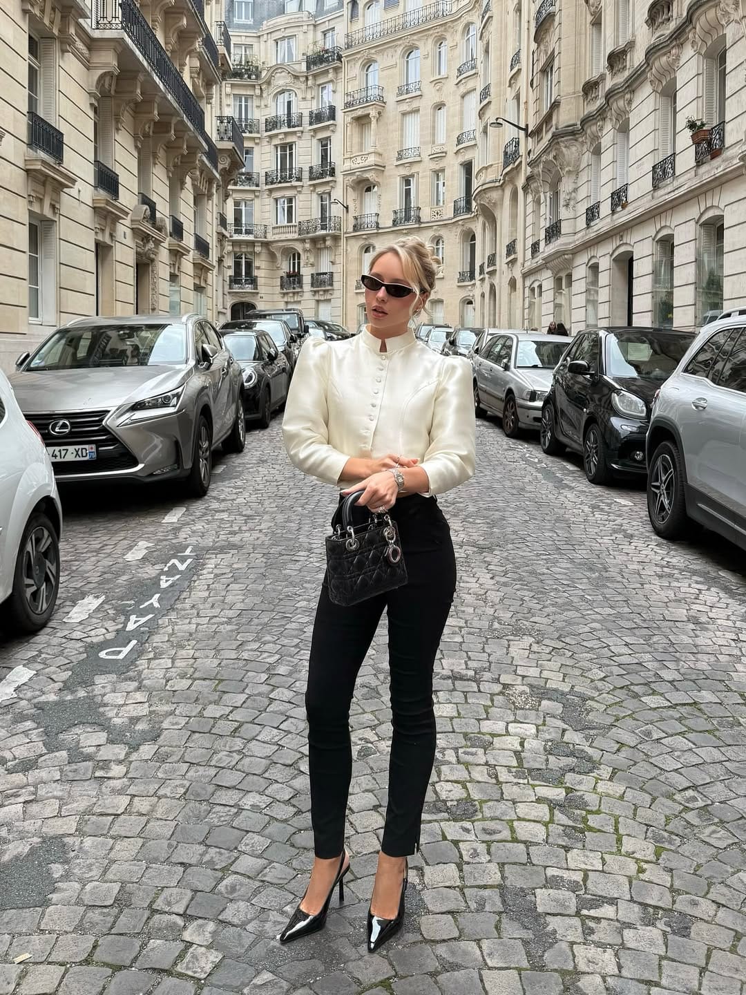 A structured ivory satin high-neck jacket with small button fastening and puffed sleeves is paired with slim black cigarette trousers, black patent pointed-toe stilettos, and a mini black Lady Dior bag, photographed on Parisian cobblestones.
