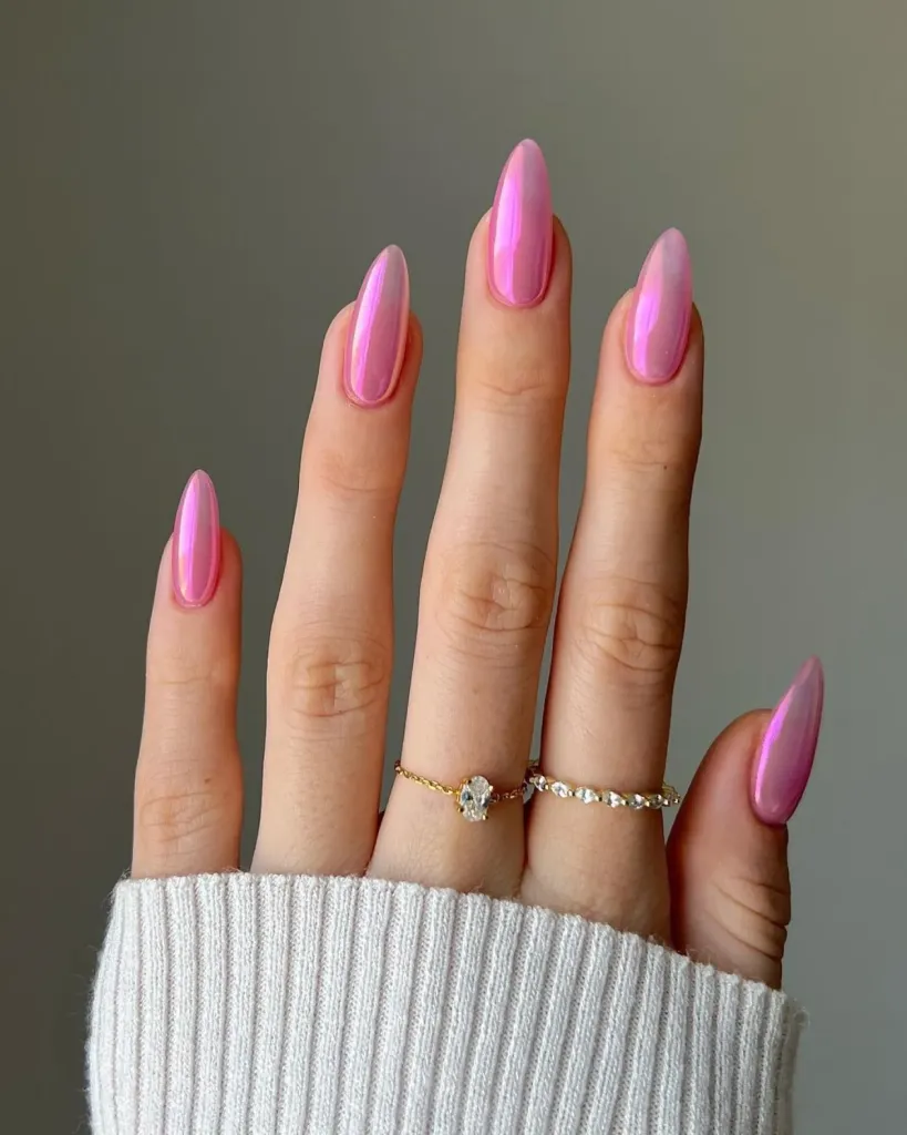 Chrome pink nails are the ultimate way to make a bold statement with your manicure. Featuring a sleek, metallic finish, these nails exude glamour and sophistication. Perfect for those who love a modern, edgy look with a touch of feminine charm!