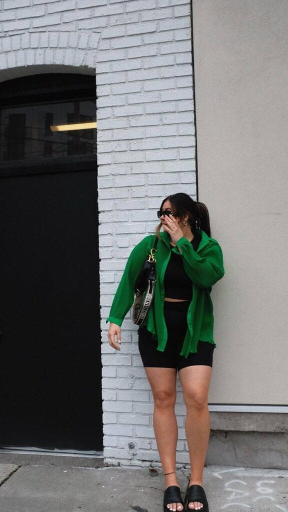 Loving the punchy vibe here—a bold green sheer shirt layered over a black crop top and fitted black bike shorts. This outfit is sporty-meets-street style and totally perfect for summer days.