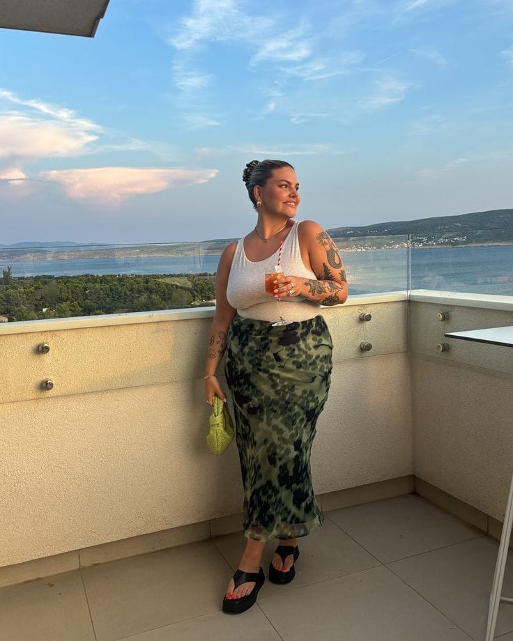 Here’s a dreamy combo—a classic white tank tucked into a flowy, green abstract-print maxi skirt. It’s simple summer chic that keeps you cool and looking put-together.