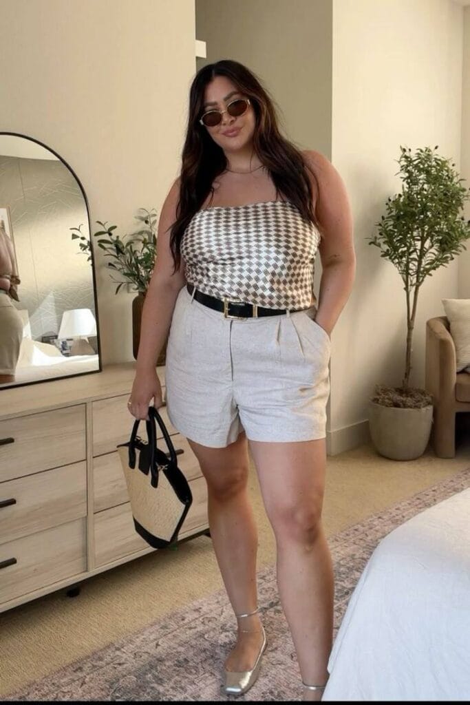 This look feels super polished—a silky checkerboard-print satin top paired with tailored beige shorts and a classic black belt. It’s the ultimate going-out-or-brunch outfit for warm weather.