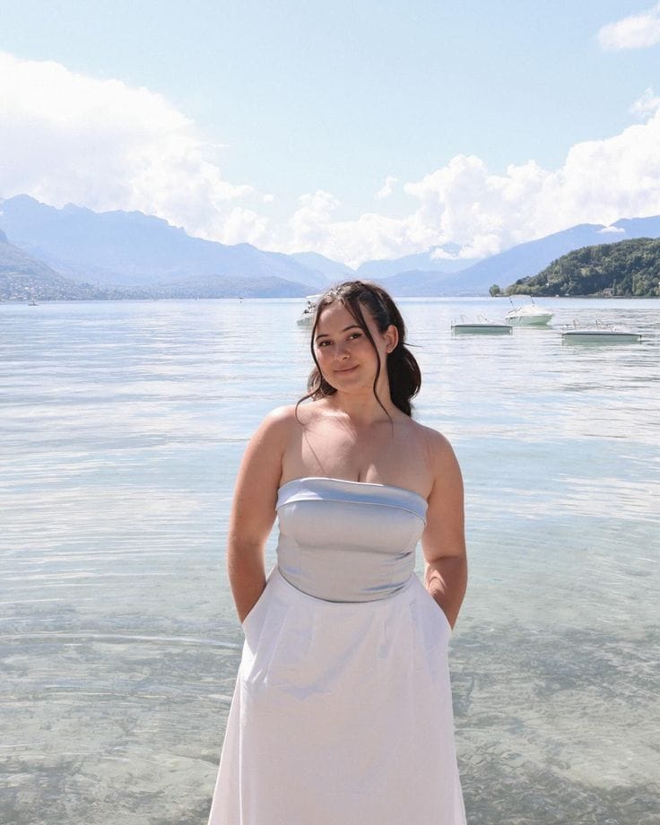 This outfit is all about soft elegance—a strapless satin maxi dress in a pale blue shade. It’s flowy, minimalist, and made for soaking up the sun by the water.