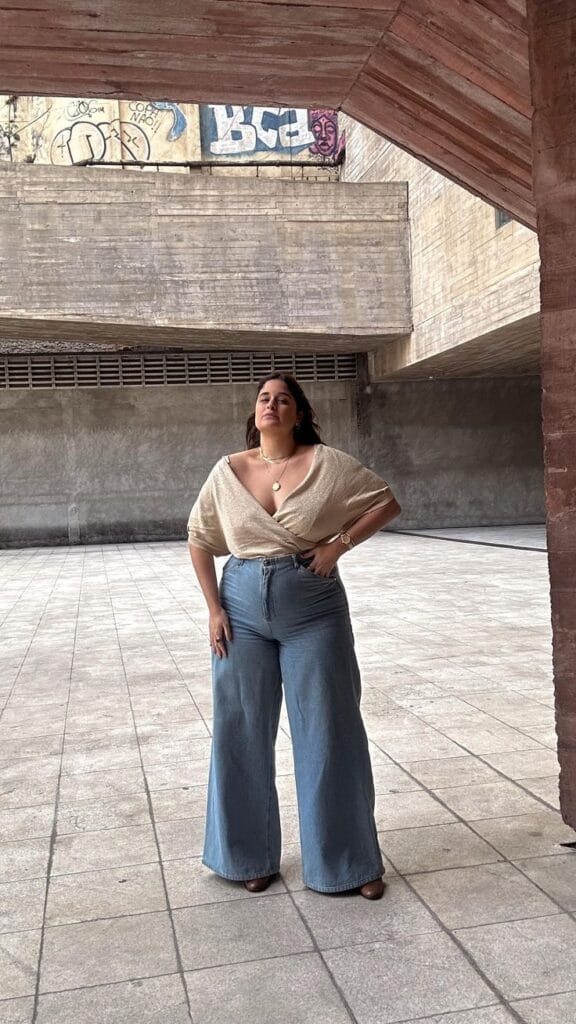 This look is total summer glam—a sparkly wrap-style top with an off-shoulder neckline paired with statement wide-leg blue jeans. It’s fresh, chic, and perfect for when you want comfy meeting confident style.
