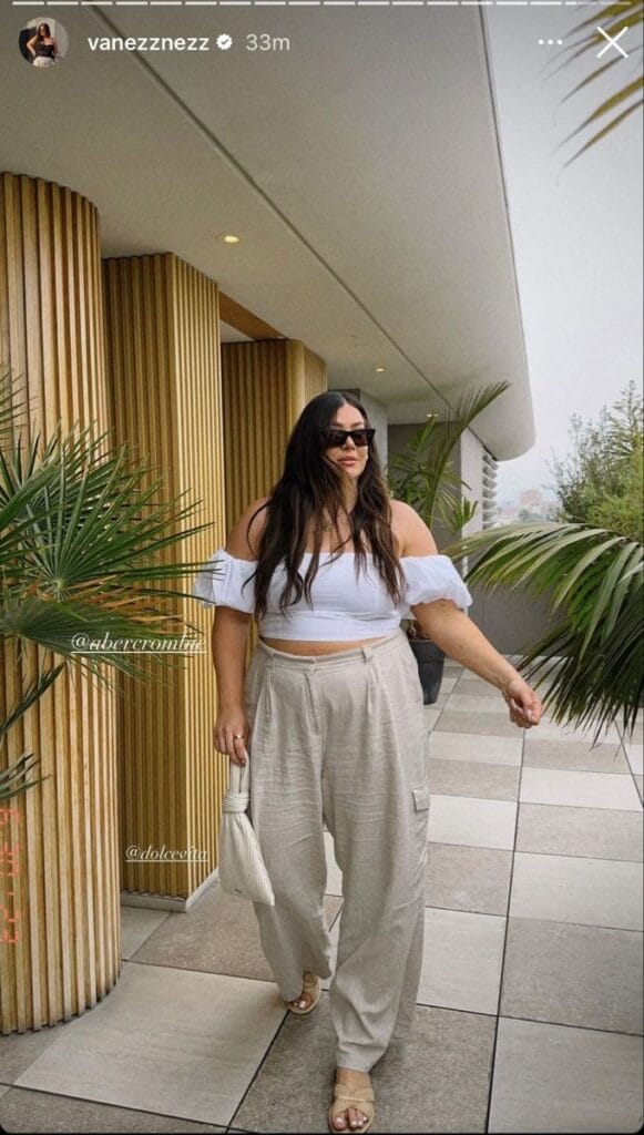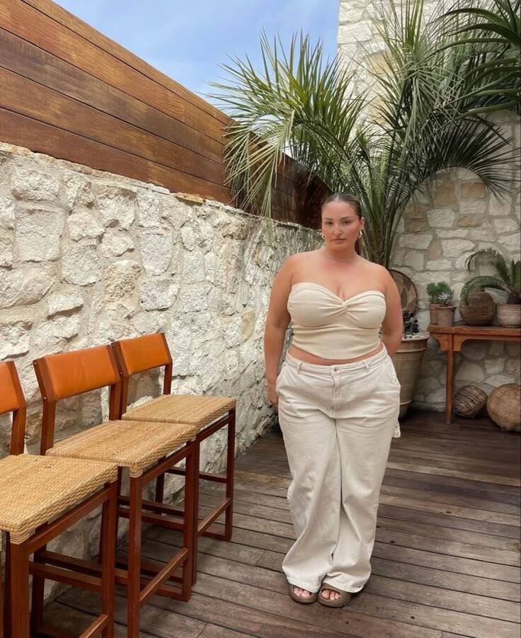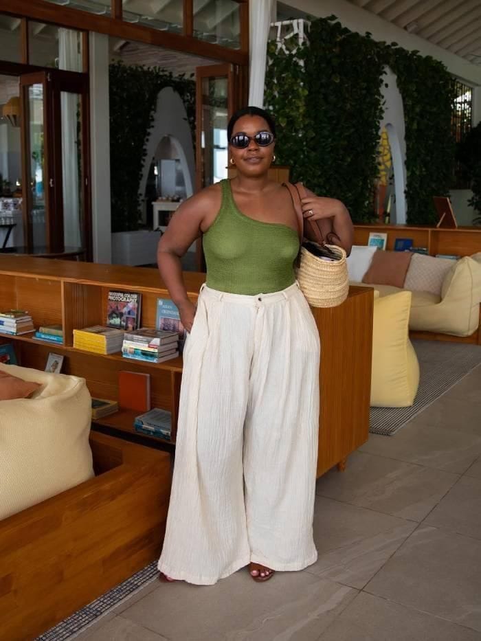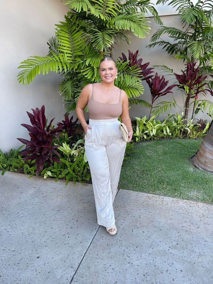 She’s giving off major vacay vibes in a blush square-neck tank top paired with creamy, high-waisted wide-leg pants. The look is fresh, sophisticated, and perfect for brunch or garden parties.