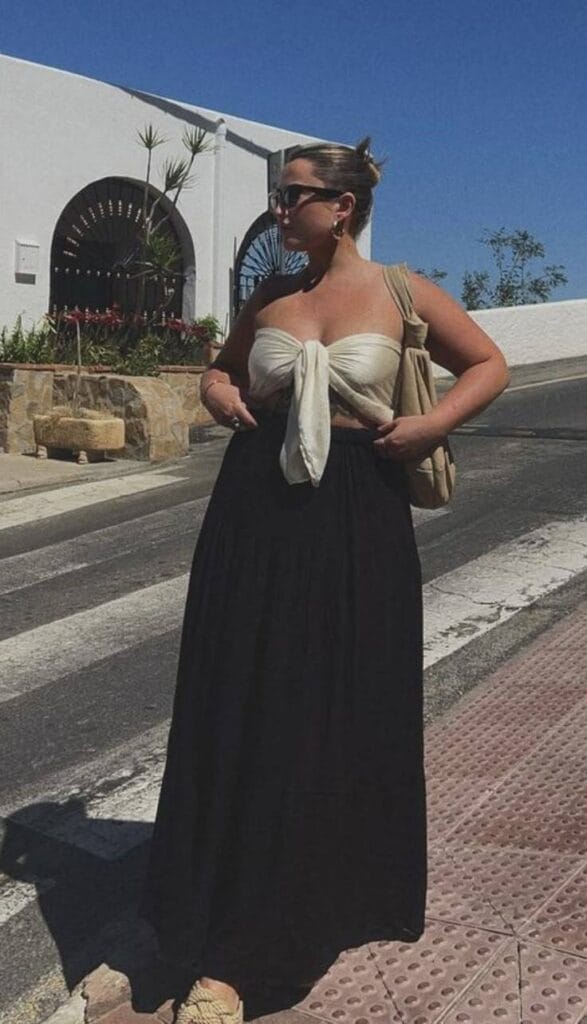 Obsessed with the contrast here—a sleek black halter top paired with a high-waisted, flowy white maxi skirt. It’s a fresh, modern combo that’s effortlessly cool.