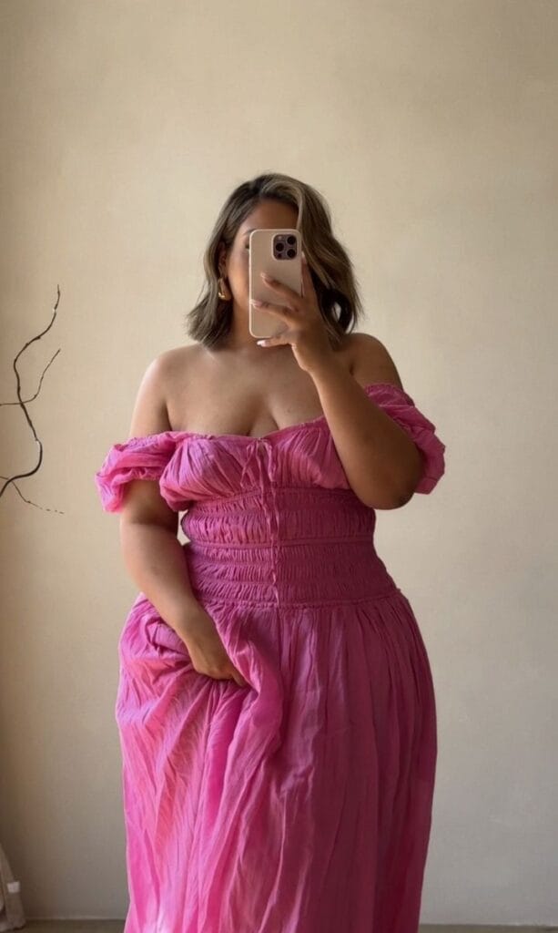 How gorgeous is this breezy, romantic off-shoulder pink maxi dress? The smocked bodice and floaty skirt make it the ultimate statement piece for summer days.