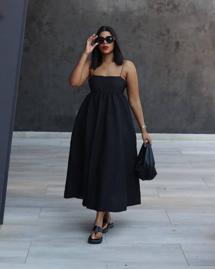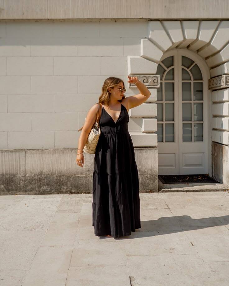 This minimalist look features a textured black strappy maxi dress that’s both graceful and easy to wear. The classic silhouette is versatile for everything from brunch to evening strolls.