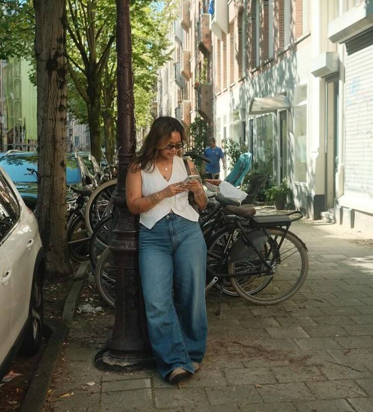 She’s keeping it causal-cool in a sleeveless white vest into high-rise, wide-leg blue jeans. It’s a laid-back, timeless combo for city adventures.