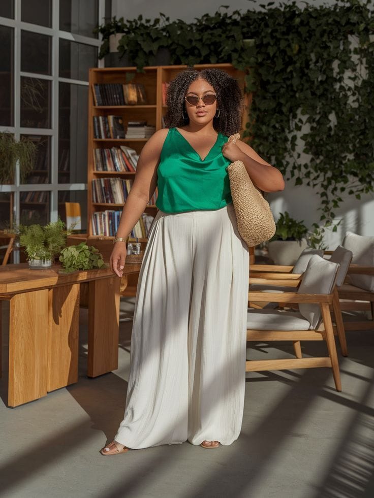 24. Vibrant Green Satin Tank with Billowy White Palazzo Pants