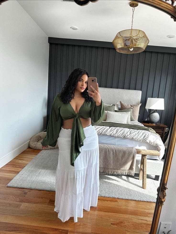 She’s rocking a playful olive green tie-front blouse with romantic billowy sleeves, paired perfectly with a tiered white maxi skirt. The look is breezy, stylish, and just right for sunny days at home or out.