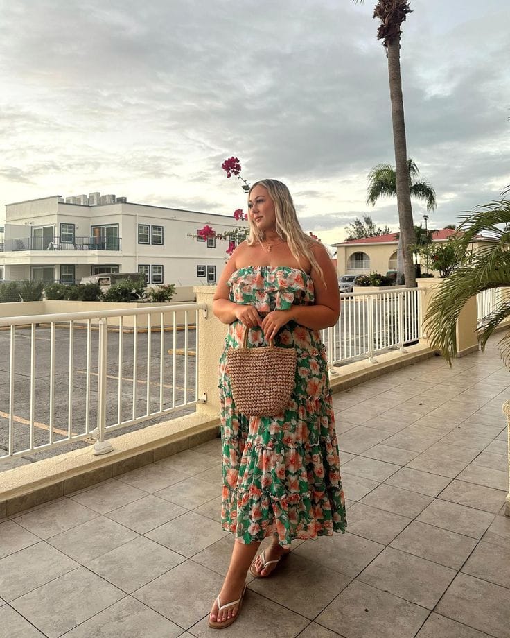 Serving major summer vibes in a colorful floral strapless midi dress with a flattering ruffled bodice. The flowy silhouette is effortless and fun—imagine sunset parties or weekend brunch!