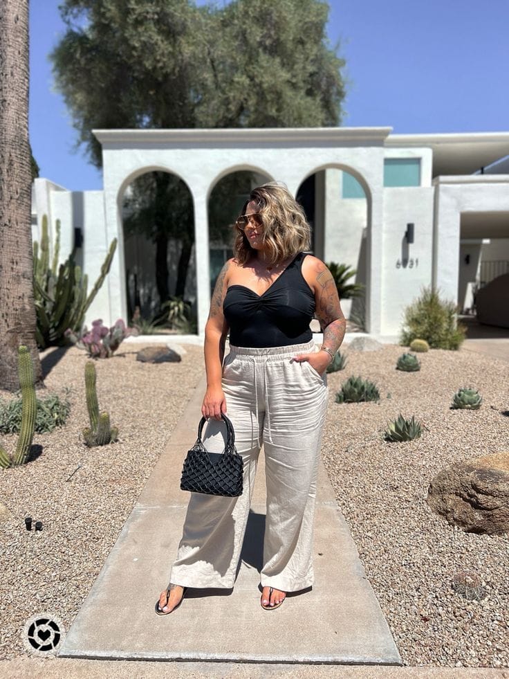 Love this refined combo—a sleek black top teamed with loose, oatmeal linen trousers for an easygoing yet polished look. It’s cool and comfortable, ready for a stroll or casual meet-up.