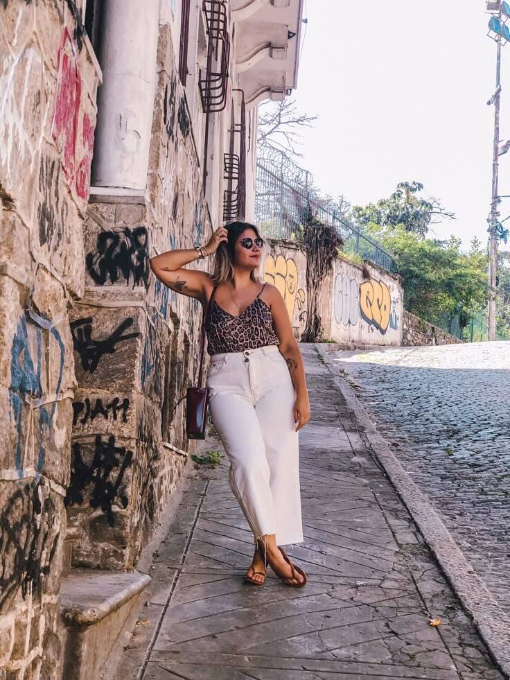 A chic animal print cami pairs up with crisp, wide-leg white jeans for a fresh, city-ready vibe. Casual and cute—just the outfit for exploring the streets or an iced coffee date.