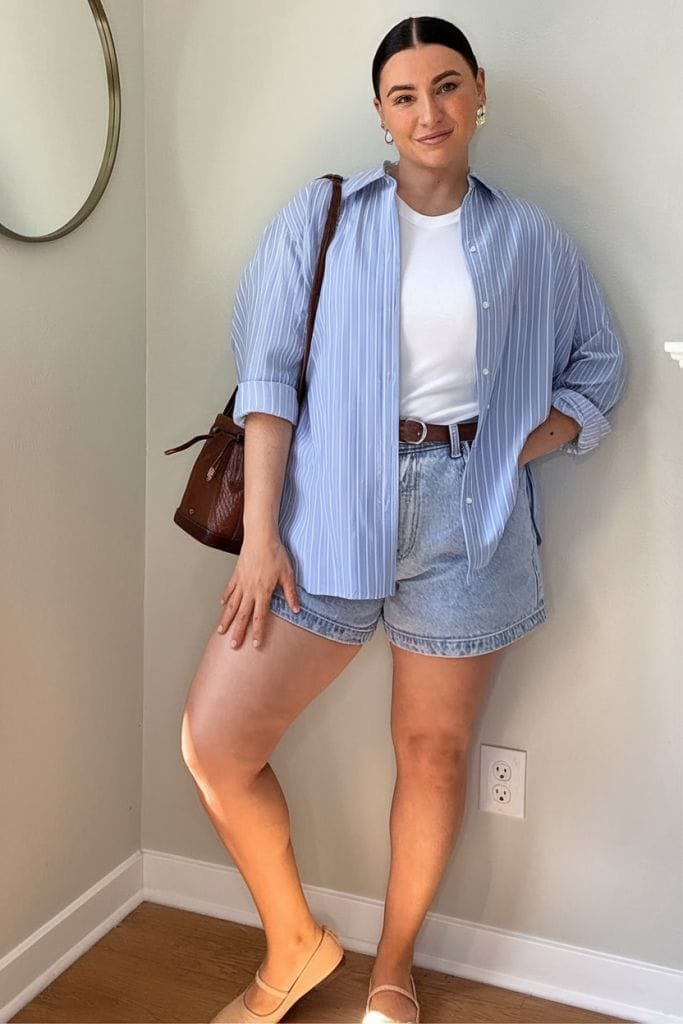 33. Crisp Blue Striped Shirt with White Tee and Light Denim Shorts