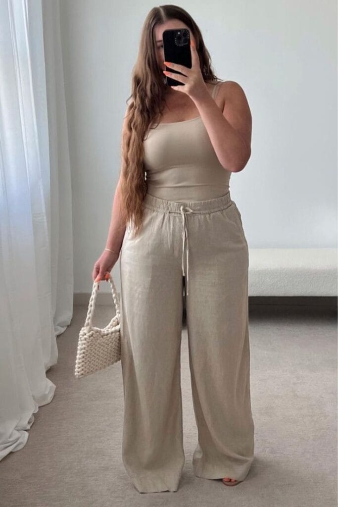 This look is all about understated elegance—a fitted taupe tank paired with soft, light taupe wide-leg pants for ultimate comfort and style. It’s easy, neutral, and seriously chic for warm weather lounging.