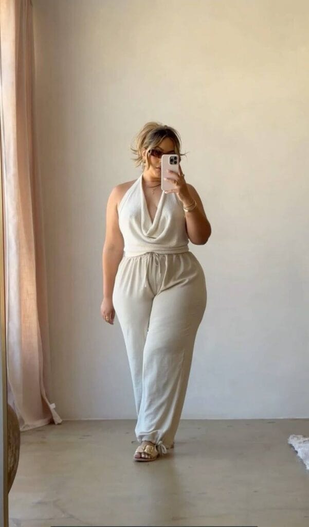I’m obsessed with this elegant off-white halter cord set—it’s effortlessly chic with a flattering draped neckline and comfy wide-leg pants perfect for summer days.