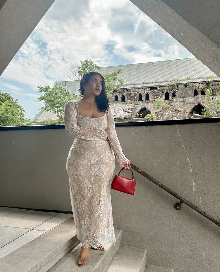 This dreamy fit features a full-length white sheer lace dress with long sleeves and a soft lining—ideal for a summer event or date night. The elegant lace detailing keeps things feminine and unforgettable.