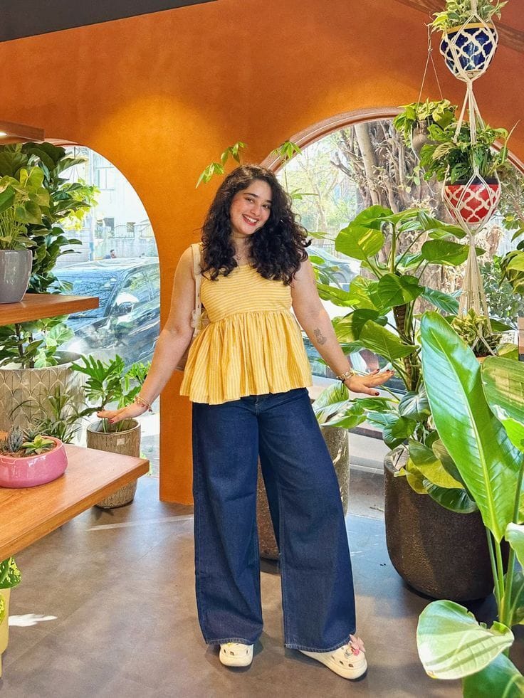 Bright and cheerful, this outfit pairs a sunny yellow peplum top with ultra-comfy wide-leg blue jeans. It’s a fun, artsy combo that brings major feel-good energy for any daytime outing.