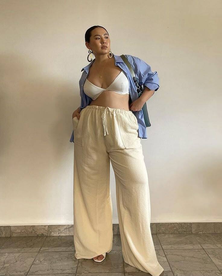 I love the easy elegance here! A breezy light blue button-down worn open over a white bralette, paired with flowy cream wide-leg pants for the dreamiest summer lounge look.