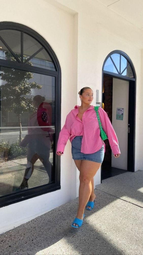 11. Vivid Pink Oversized Shirt with Classic Blue Denim Shorts