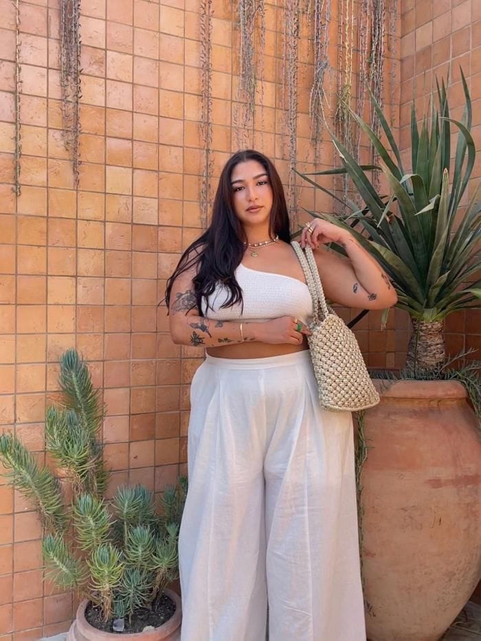 1. Summer Chic: Crop Top with Wide-Leg Trousers and Straw Bag