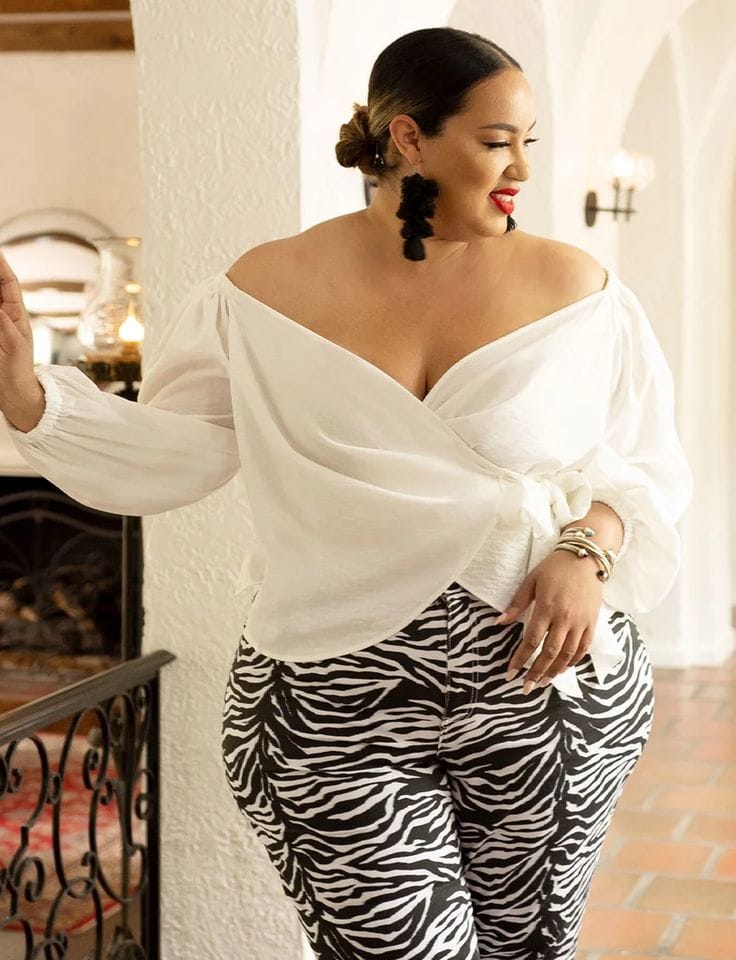 Make a bold statement with Safari Glam, pairing a crisp white off-the-shoulder top with chic zebra print pants.