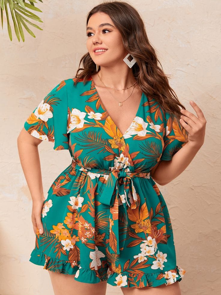 19. Floral Flair: Plus Floral Print Belted Ruffle Hem Romper