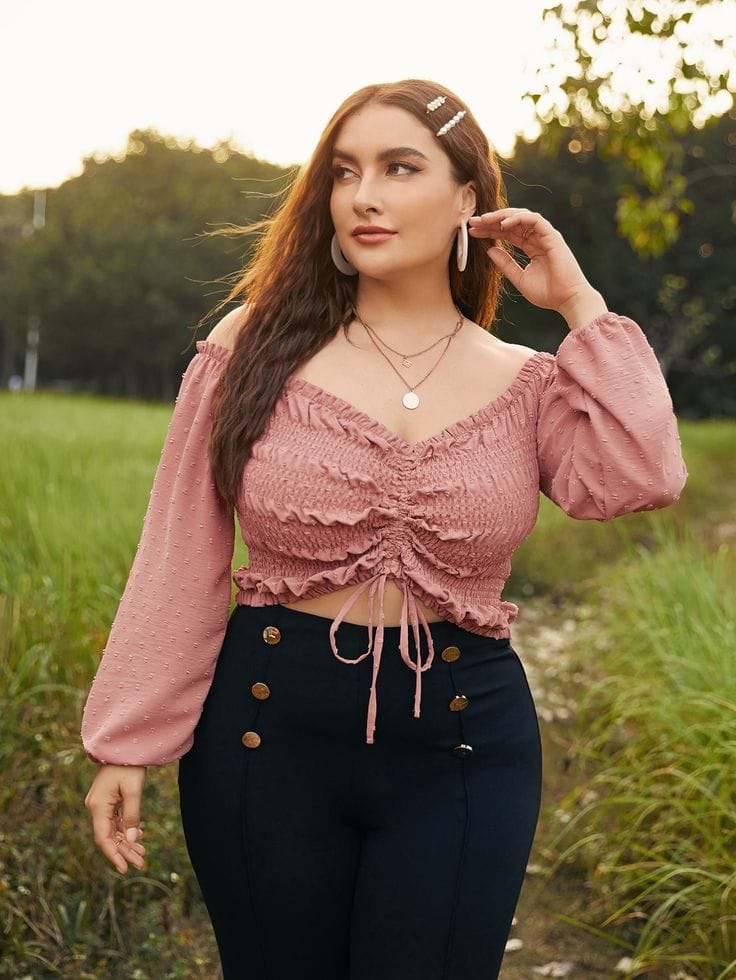 23. Milkmaid Chic: Plus Solid Shirred Drawstring Front Milkmaid Crop Top with Jeans