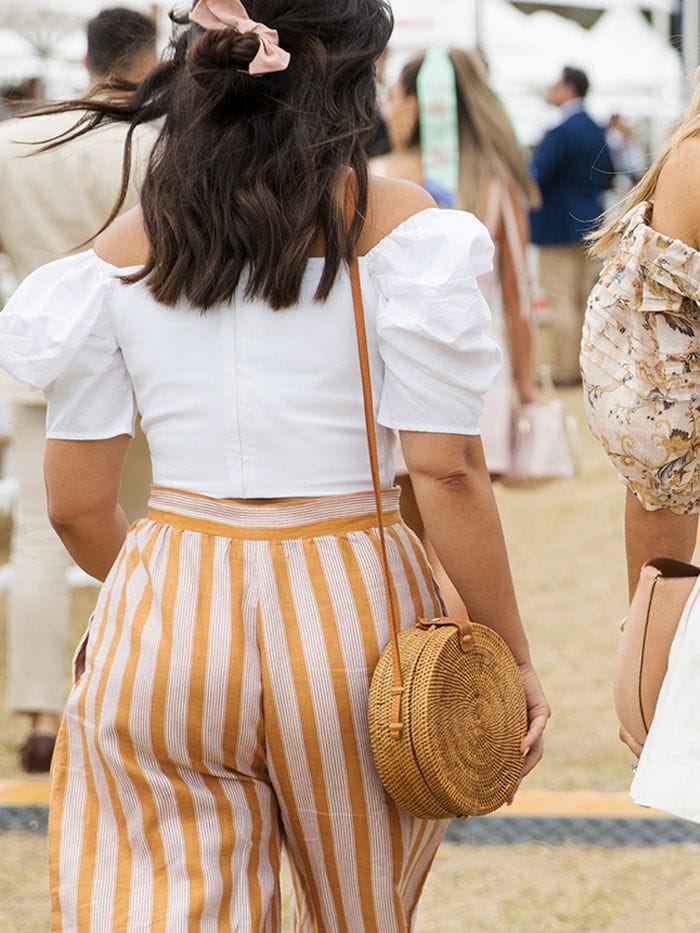 Add a touch of whimsy to your summer wardrobe with this whimsical ensemble featuring a puffy sleeve top paired with striped pants.