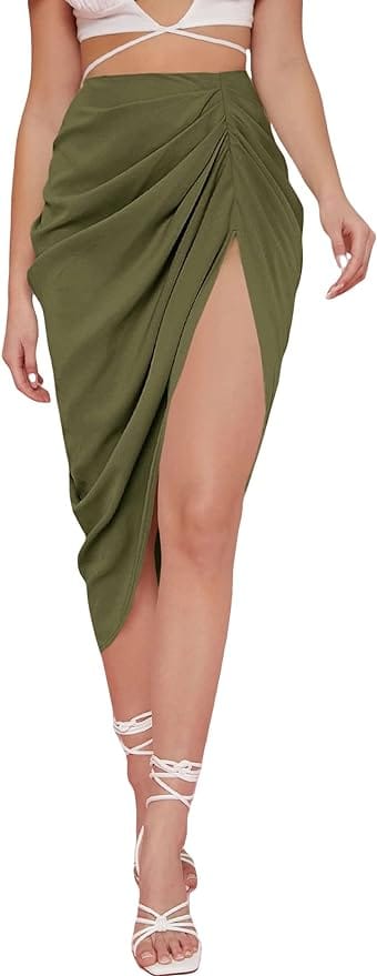 A sleek black top paired with a ruched front and back midi skirt creates a sophisticated silhouette, perfect for both daytime outings and evening events.
