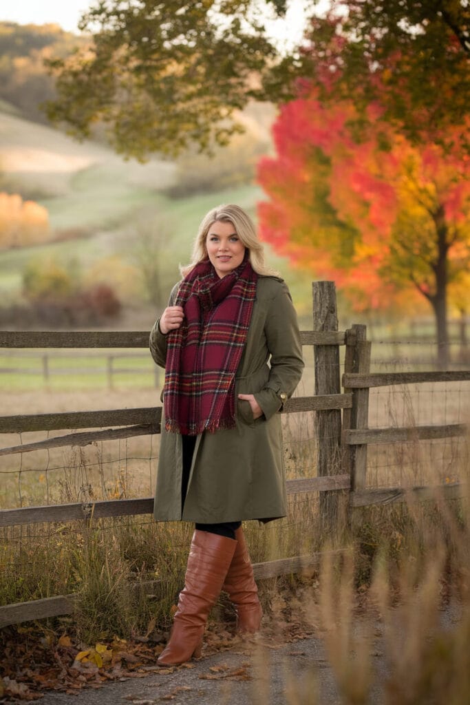 Elevate your Thanksgiving style with an olive trench coat, burgundy scarf, and knee-high boots. This polished combo adds a sophisticated, autumnal touch to any look, perfect for outdoor or formal gatherings.
