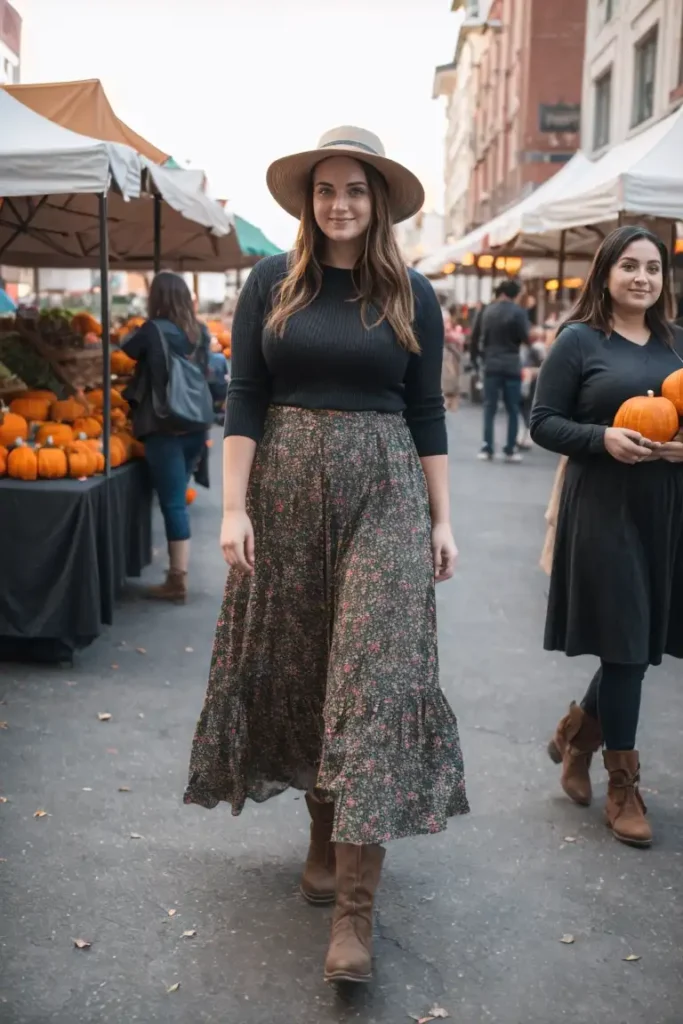 Channel your inner boho queen with a printed maxi skirt paired with a cozy sweater. This combination offers a laid-back, chic vibe that’s perfect for a relaxed yet stylish Thanksgiving celebration.