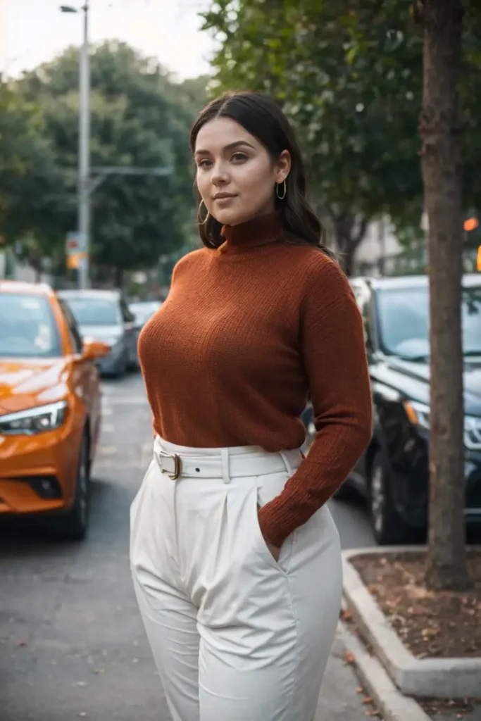A neutral turtleneck sweater tucked into high-waisted pants creates a sleek, polished look that’s easy to wear all day. This combo is perfect for a Thanksgiving dinner where you want to keep it classy and comfortable.