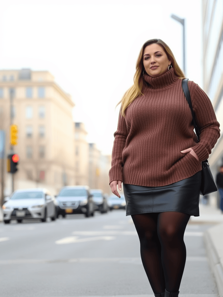 Go for a sleek, edgy vibe with a turtleneck sweater and leather skirt. This outfit strikes the perfect balance between cozy and chic, making it an ideal choice for a trendy Thanksgiving look.
