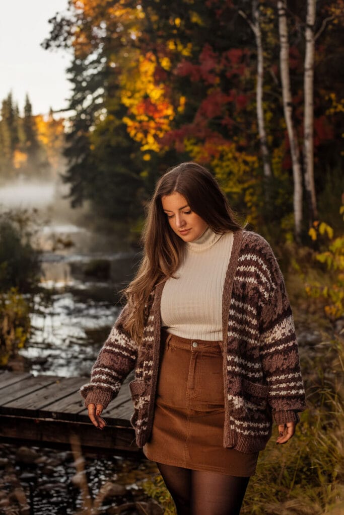 For a classic fall look, try a knit cardigan layered over a turtleneck with a corduroy skirt. This ensemble is perfect for staying cozy while looking timelessly chic during your Thanksgiving festivities.