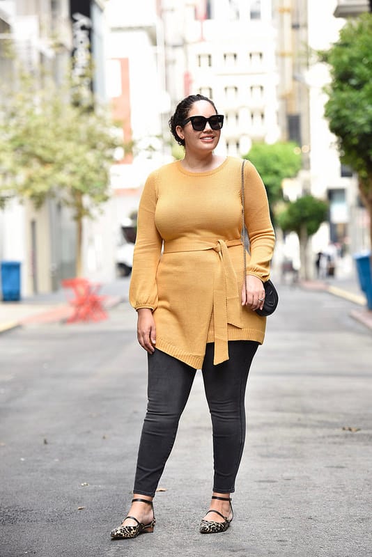 @ girlwithcurvesA yellow faux wrap sweater paired with black jeans adds a pop of color to your Thanksgiving wardrobe. This outfit is comfortable, stylish, and ideal for a cozy holiday celebration.