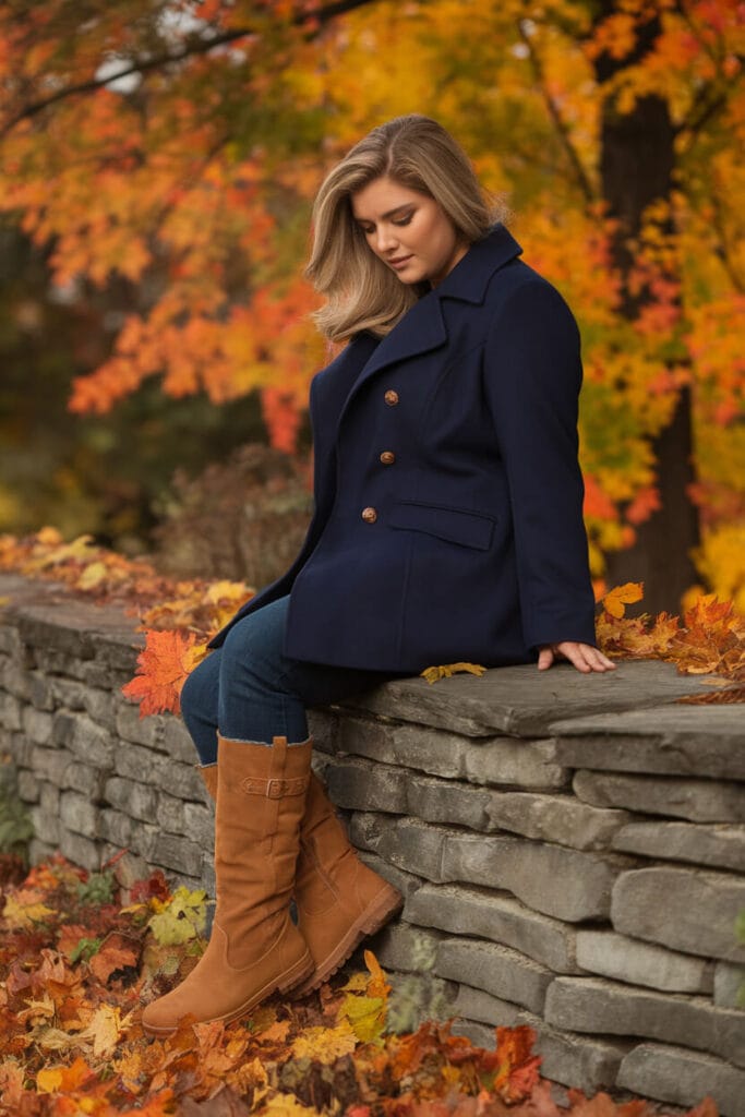 A navy peacoat with dark jeans and riding boots creates a classic, polished look perfect for Thanksgiving. This timeless combo is both stylish and comfortable, keeping you warm while looking effortlessly chic.