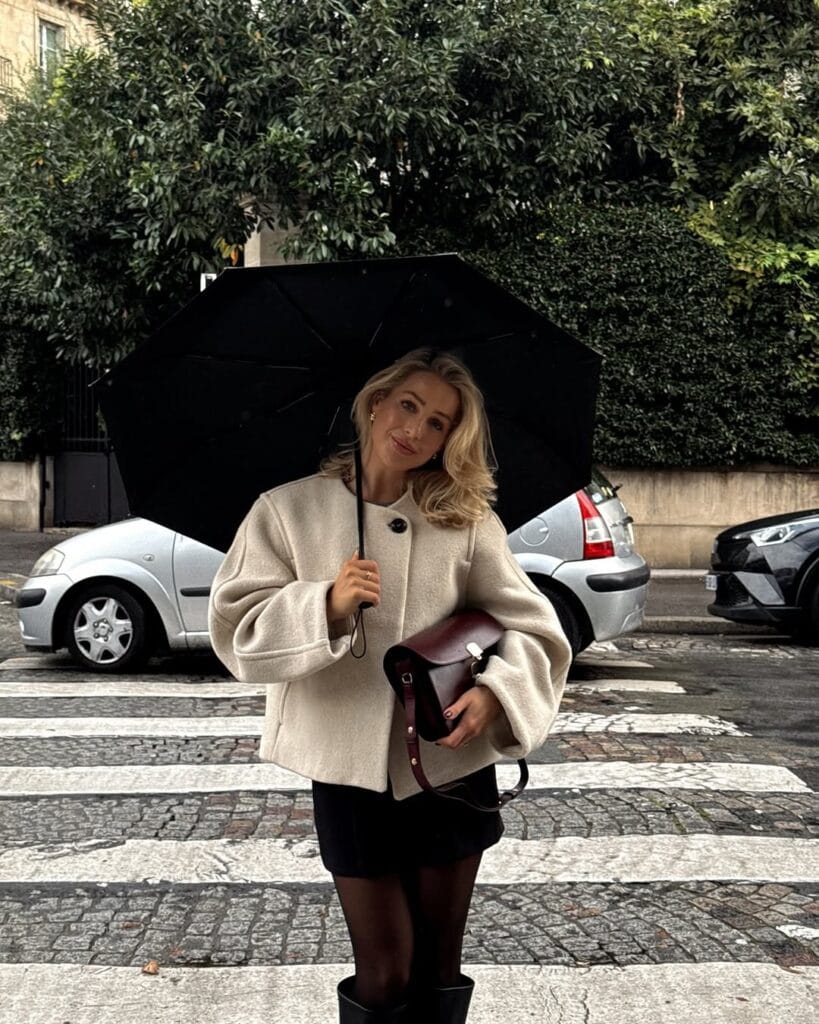 @ allchloeroseTurn any drizzly day into a fashion moment with this irresistibly cozy look! An oversized cream jacket brings luxe comfort layered over a little black skirt, teamed with sheer tights and sleek knee-high boots. Add a rich burgundy crossbody bag and a classic black umbrella, and youāre totally ready to brave the streetsāchic, comfy, and unfazed by the rain.