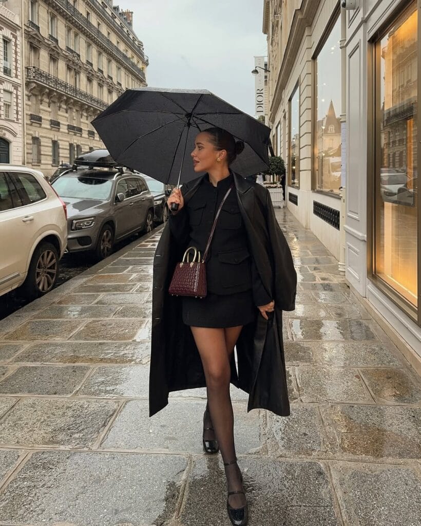 @ fleurraffanWhen grey skies call, why not serve a little runway drama? This chic combo pairs a tailored black mini and utility jacket with sheer tights, classic ankle-strap heels, and an elegant long trench. Finished with a luxe croc-embossed burgundy bag, itās the picture of Parisian coolāperfect for turning a rainy stroll into a style moment!