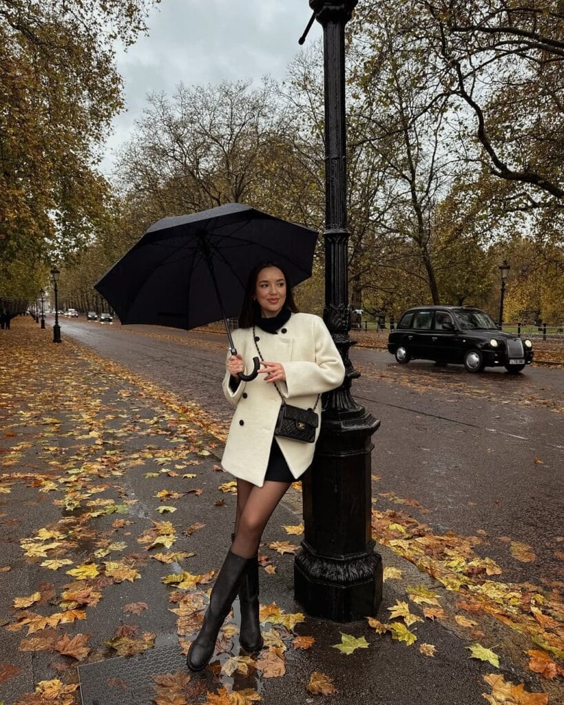 @ fleurraffanEmbrace rainy day elegance with this timeless city look! A crisp ivory double-breasted coat adds instant sophistication over a sleek mini skirt and sheer tights, elevated by polished black knee-high boots. With a quilted crossbody bag and a trusty black umbrella, this outfit is perfect for wandering leaf-strewn streets in styleāLondon cab vibes included!