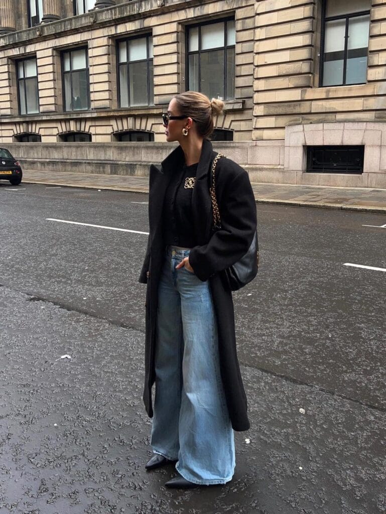 @ emilyshakCould this outfit be more perfect for a drizzly city stroll? A flowy black duster coat brings instant drama and warmth, layered over a chic black knit. The real statement: those super-wide, light-wash jeans that add vintage, easy-going flair. Polished off with pointed black boots, a statement gold chain bag, and subtle gold earrings, this look is effortlessly comfy and fashion-forwardāideal for puddle-hopping in style!