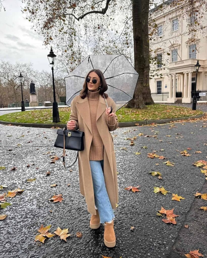 @ rebeccafayehudsonNothing says rainy day chic like a long, camel trench coat draped over a cozy mocha turtleneck sweater and relaxed blue jeans. Add tan suede ankle boots, a classic black satchel, and a clear umbrella for that effortlessly stylish, city-wandering vibeāproof that you can be cute, comfy, and weather-proof all at once!