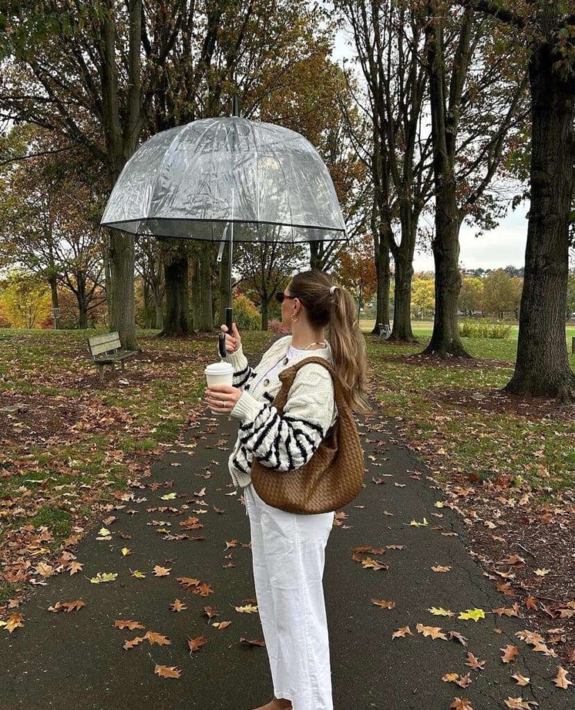 Who says drizzle days canāt be the coziest style days? Hereās proof: a creamy cable-knit cardigan with playful black stripes takes center stage, paired perfectly with breezy white wide-leg pants for that easy, off-duty vibe. Tan slides and a slouchy woven tote keep things chic but practical, while a clear bubble umbrella and warm takeaway coffee make this the ultimate park-stroll look when the leaves and raindrops start to fall!