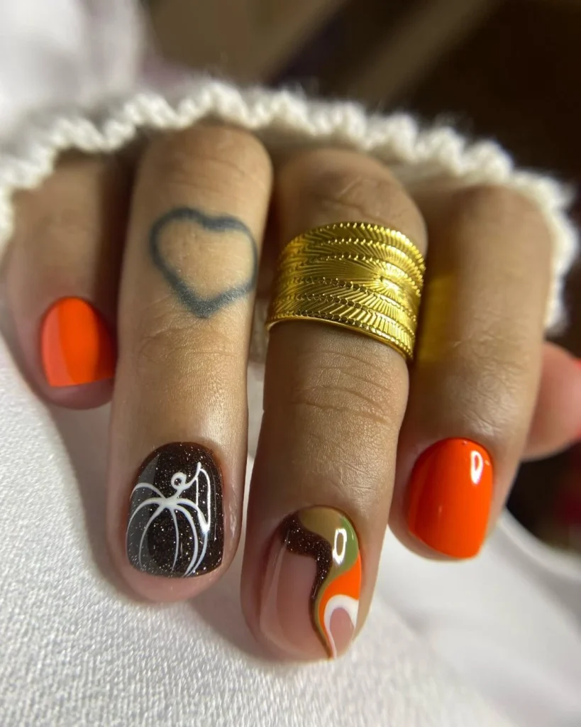 Channel the cozy charm of autumn with pumpkin spice short fall nail designs.
